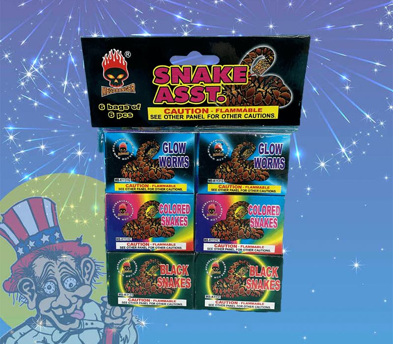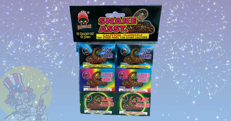 GLOW WORMS, COLORED SNAKES, BLACK SNAKES 6 BAGS 6 PIECES