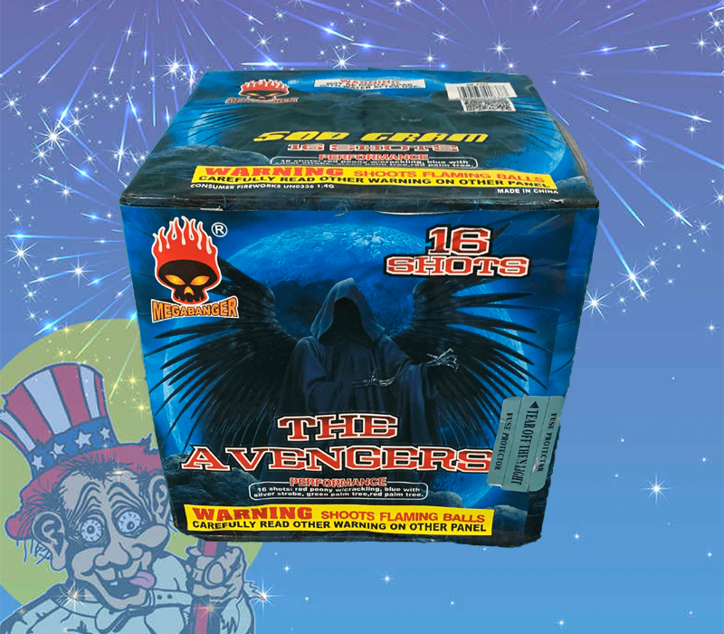 16 SHOTS: RED PEONY W/CRACKLING, BLUE WITH SILVER STROBE, GREEN PALM TREE, RED PALM TREE